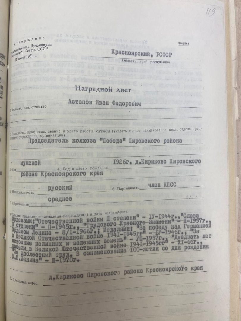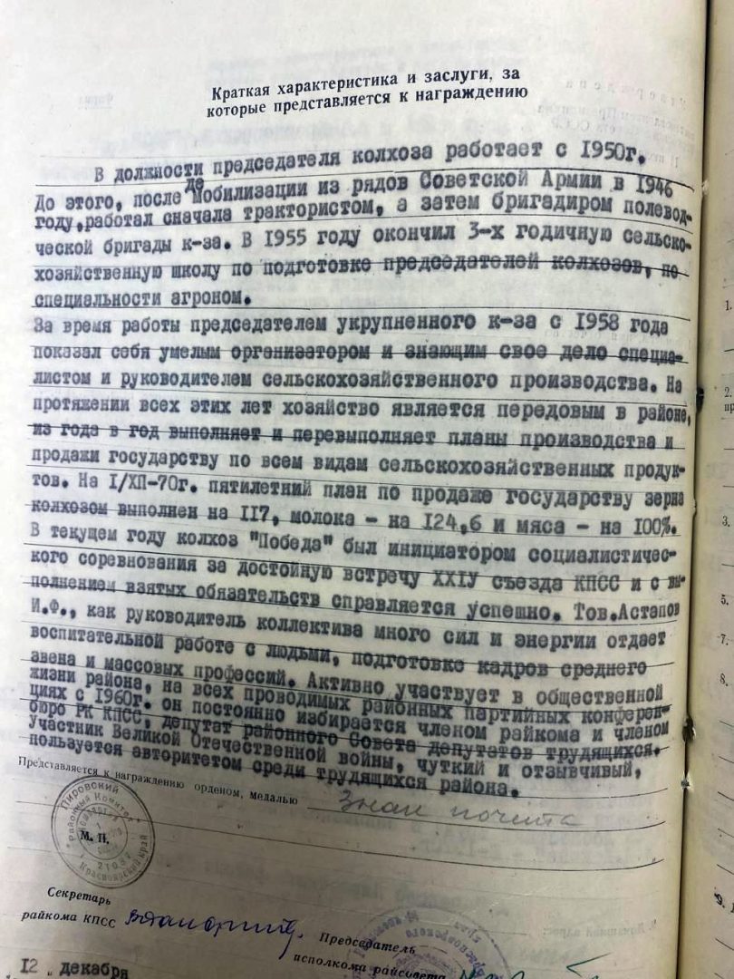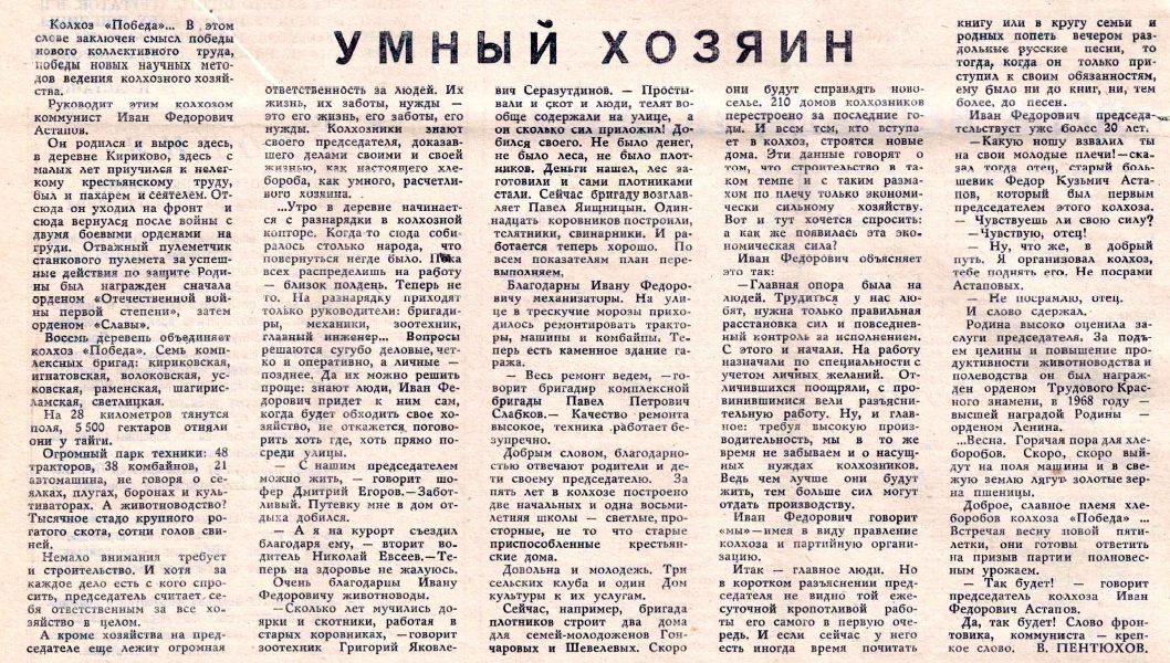 Председатель колхозов: имени Ворошилова (1950-1958), «Победа» (1958-1985).
