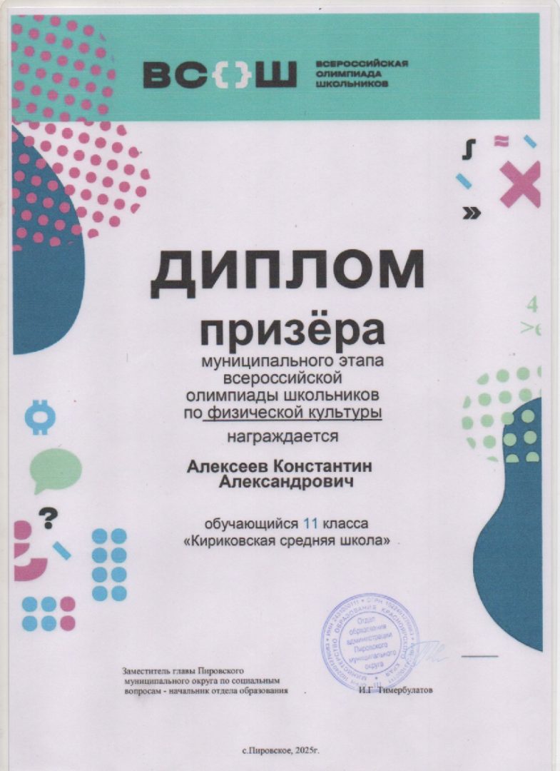 Алексеев Константин Призёр по физической культуре МЭ ВсОШ