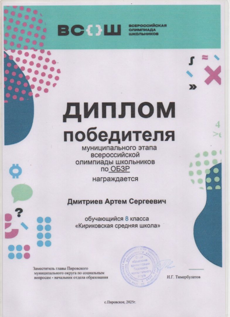 Дмитриев Артём победитель по ОБЗР МЭ ВсОШ