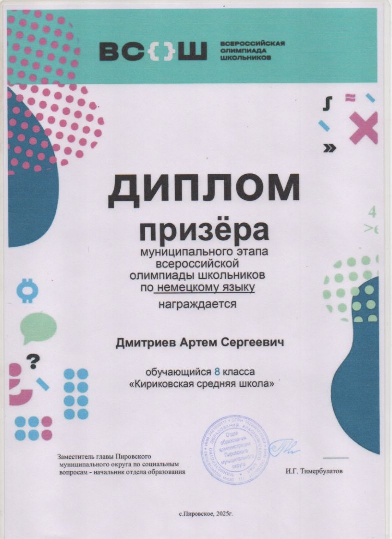 Дмитриев Артём призер по немецкому языку МЭ ВсОШ