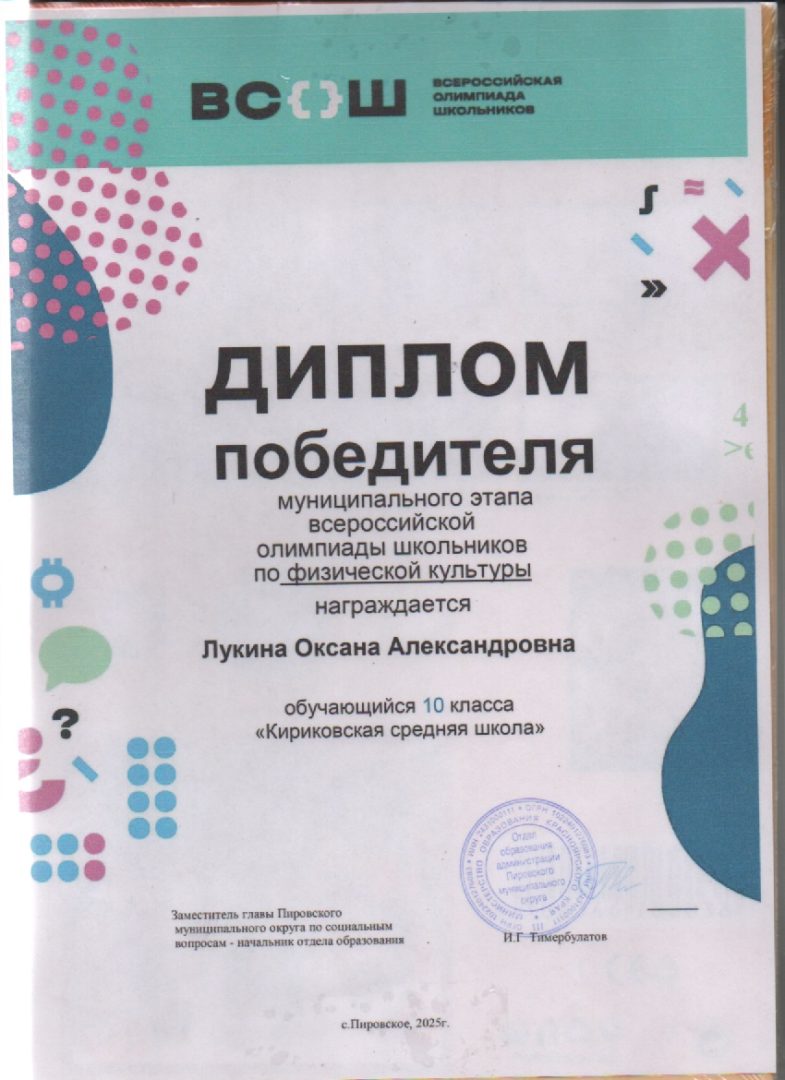 Лукина Оксана победитель по физической культуре МЭ ВсОШ