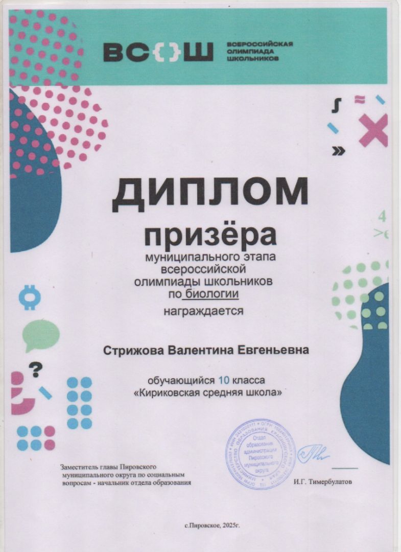Стрижова Валентина Призёр по биологии МЭ ВсОШ