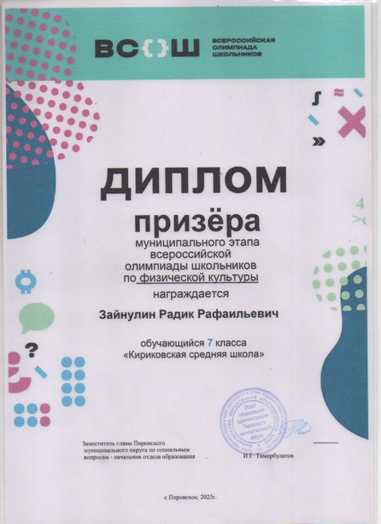 Зайнулин Радик призёр по физической культуре МЭ ВсОШ