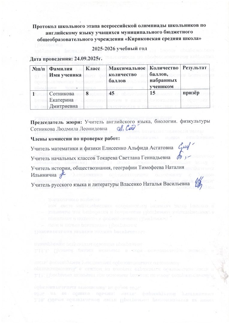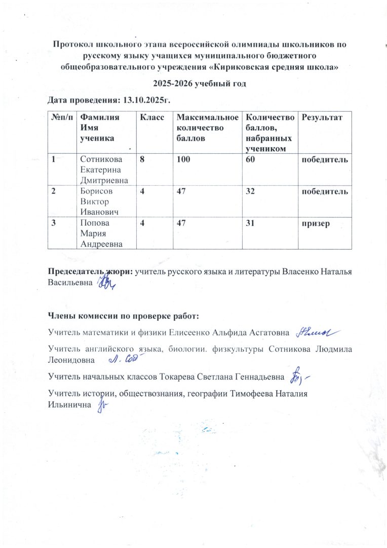- Протокол школьного этапа ВсОШ по ОБЗР Кириковская средняя школа