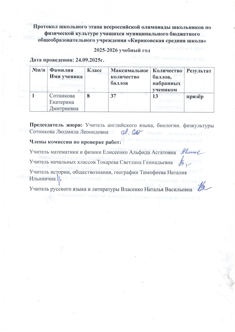 - Протокол школьного этапа ВсОШ по физической культуре Кириковская средняя школа