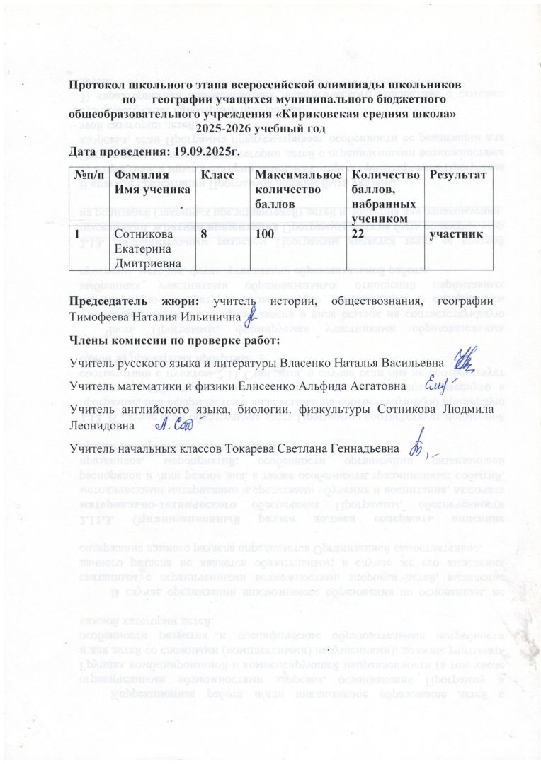 - Протокол школьного этапа ВсОШ по географии Кириковская средняя школа