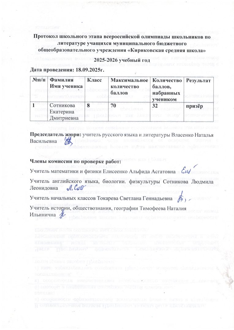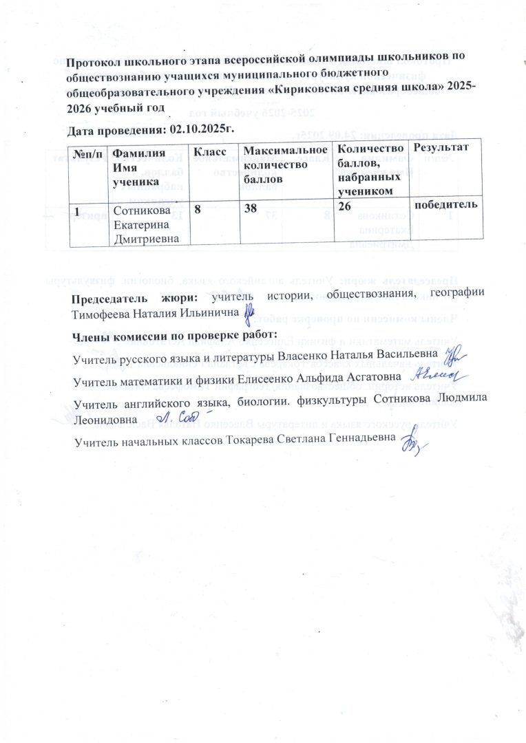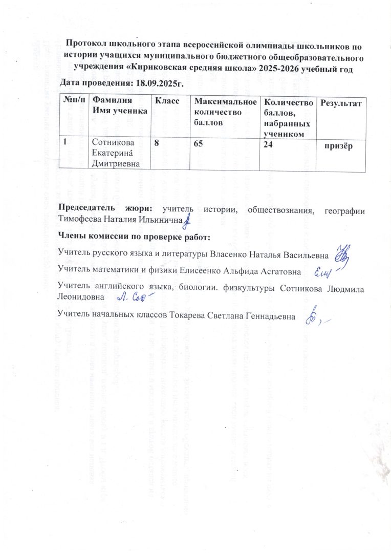 - Протокол школьного этапа ВсОШ по истории Кириковская средняя школа