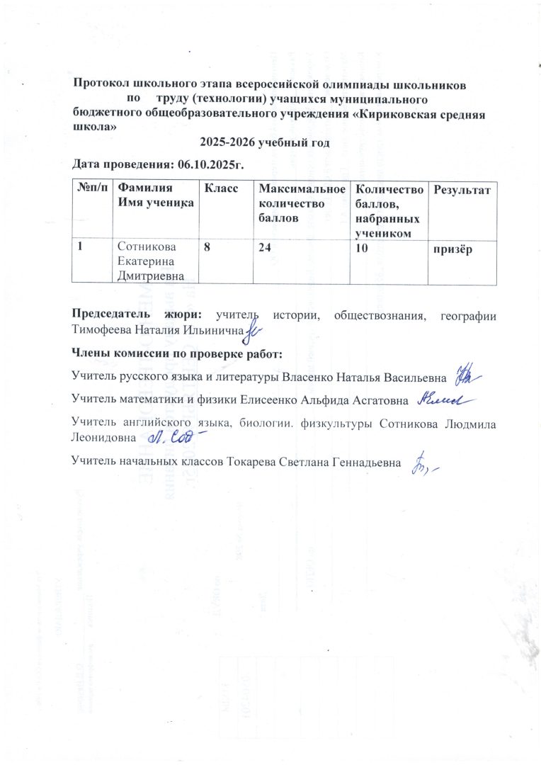 - Протокол школьного этапа ВсОШ по технологии 6 класс 2024-2025 учебный год