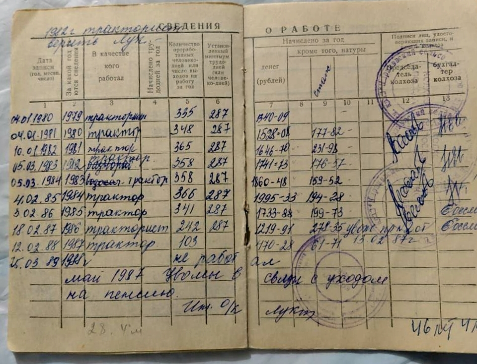 Вся многолетняя трудовая деятельность связана была с родным колхозом (1943-1987).